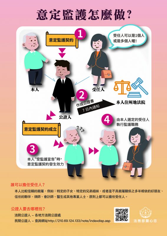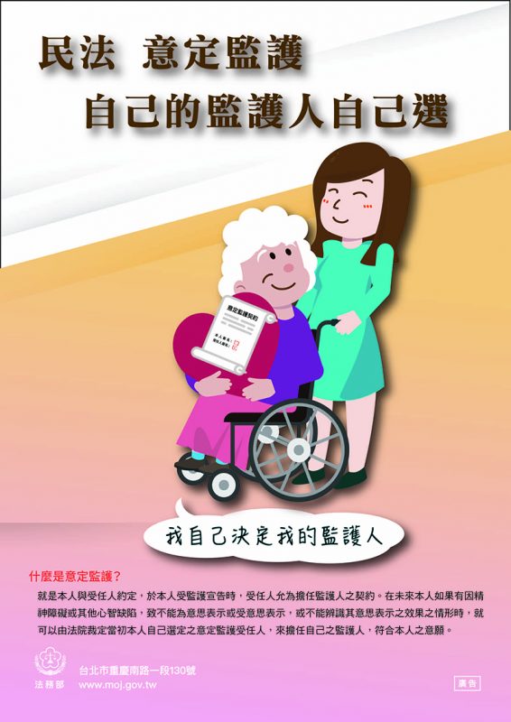 立法院於24日三讀通過「民法部分條文修正草案」(意定監護),主管機關法務部表示,民法意定監護條文可使我國成年監護制度在原有「法定監護制度」外,更加完善,尊重當事人的意願,達成「自己的監護人自己選」目標。